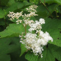 オニシモツケは、北海道から本州中部以北に分布し、千島列島、樺太、カムチャッカ半島などにも観られるます。山地の日当たりの良い湿った草地に群生する大形の多年生草本です。シモツケソウ(下野草)に似ていますが2m近くにもなります。葉は、頂小葉が特に大きく縁には重鋸歯があります。茎の先に散房花序をだし、白色の小さな花を咲かせます。