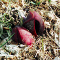 ザゼンソウは、本州中部から北海道に分布し、低地や山地の湿地に生える多年生の野草です。雪が解けるとすぐに見ることのできる花です。花は花弁のないたくさんの花が集まって棍棒状になった肉穂花序で、この花序を包む大きな苞が仏炎苞です。花の形が僧侶が座禅を組む姿に見えることが、和名の由来とされています。また、花を達磨大師の座禅する姿に見立てて、ダルマソウ(達磨草)とも呼ばれています。花を咲かせる際に発熱する珍しい植物です。