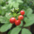 トチバニンジンは、北海道から九州に分布し、明るい森林の樹林下に生える多年生の野草です。茎は結節があって地中を長く横に這っていきます。葉は5小葉で構成される掌状複葉で、茎に3から5枚輪生させます。初夏に茎の先端に球状に黄緑色の小さい花をたくさんつけます。根茎をチクセツニンジン(竹節人参)といい、薬用植物として利用されています。